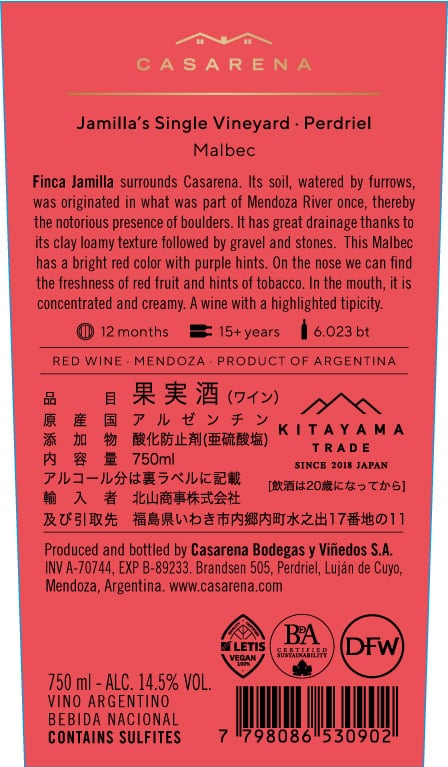 カサレナの4つの畑はそれぞれ異なる土壌で、数メートル場所を移して植えただけでもブドウは異なる成長を見せるほど複雑です。このように多様なテロワールの個性の違いを上手く表現したいというコンセプトの下、ジャミラ畑で収穫されたマルベックのみ使用して造られた、シングルヴィンヤード・シリーズです。ぜひ、ご堪能ください。